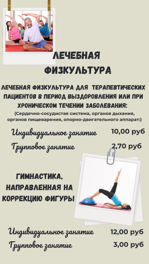 Занятия проходят в специальном зале ЛФК, оснащенном современным оборудованием для тренировок. Небольшие нагрузки пойдут на пользу взрослым и детям. Занятия помогут оставаться бодрыми, укрепить иммунитет и поправить существующие проблемы со здоровьем. Сеансы лечебной физкультуры проходят под контролем квалифицированных специалистов.